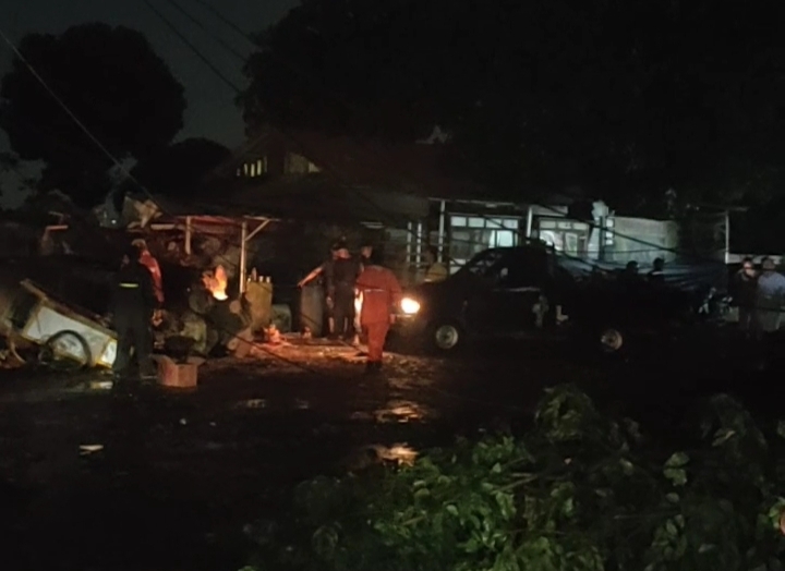 Tak hanya kendaraan, sejumlah fasilitas usaha warga di sekitar lokasi turut terdampak. Sebuah warung kopi serta gerobak pedagang rujak yang berada di pinggir jalan mengalami kerusakan cukup parah setelah tertimpa bagian batang pohon yang roboh.